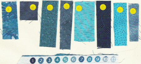 ~In quilting a 'strip' is the width of the fabric (WOF) cut from selvage to selvage. Two fat quarter (FQ) strips would equal one WOF strip. ~Be sure to print this web page instructions and the Fabric Key above for reference. ~Tone-on-tone fabrics without a print direction are suggested for Fabrics B to H. ~Make yourself a fabric guide with small bits of fabrics taped to a card: